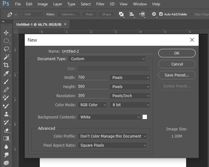 Ctrl + N : 포토샵 preset이 열림/용지 설정 및 옵션값 정하기!!