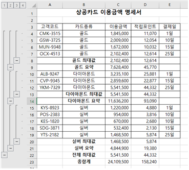 [부분합] 기능을 이용하여 ‘상공카드 이용금액 명세서’표에 <그림>과 같이 카드종류별로 ‘이용금액’과 ‘적립포인트’의 합계와 최대값을 계산하시오.