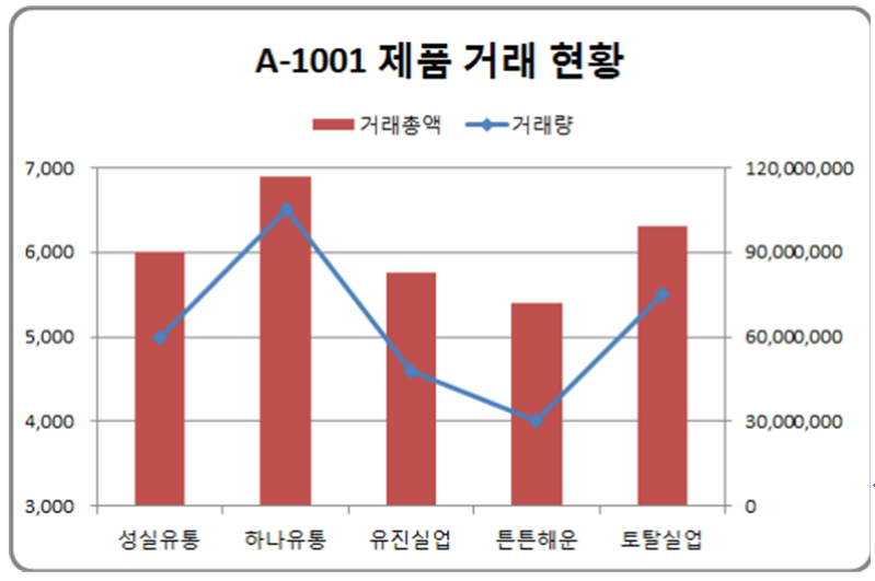 ① 제품코드가 ‘A-1001’인 제품만 ‘거래처명’별 ‘거래량’과 ‘거래총액’계열이 차트에 표시되도록 데이터 범위를 지정하시오.