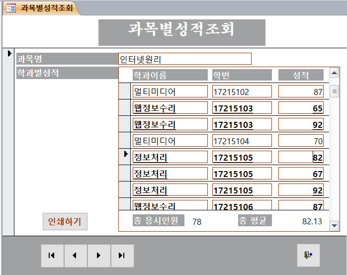 3. ‘과목별성적조회’ 폼의 ‘인쇄하기(cmd인쇄)’ 버튼을 클릭하면 다음과 같은 기능을 수행하도록 매크로 함수로 구현하시오. (5점)