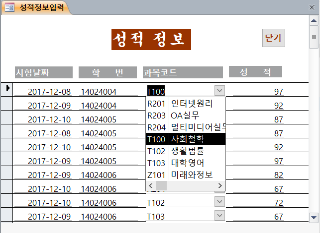 ▶ ‘txt과목명’에 입력된 과목명에 해당하는 레코드만 표시할 것