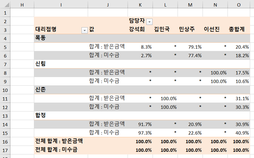 ▶ ‘받은금액’과 ‘미수금’을 열 합계 비율을 기준으로 나타나도록 작성하시오.