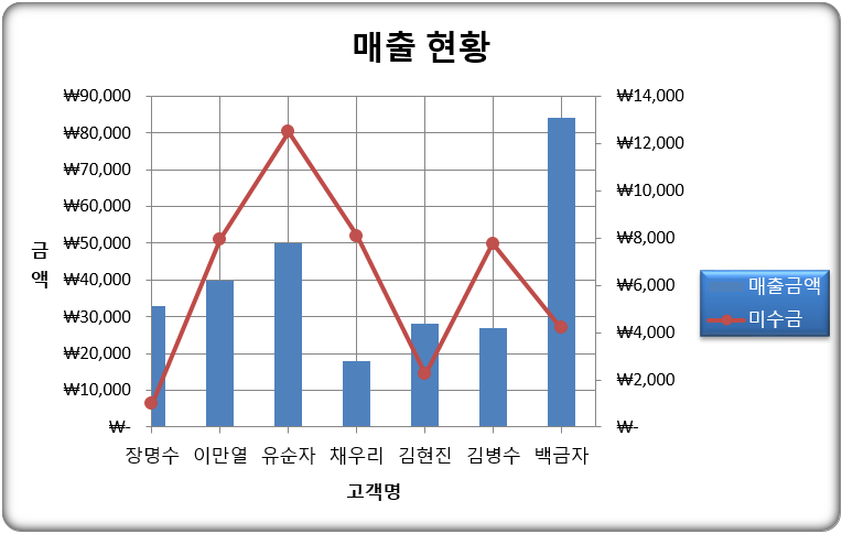 ① ‘미수금’ 계열의 차트 종류를 ‘표식이 있는 꺽은선형’으로 변경한 후 보조 축을 지정하시오.