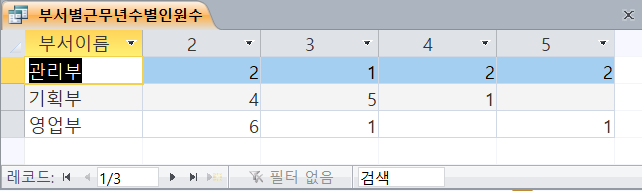 1. 다음과 같이 부서별 근무년수별 인원수를 나타내는 크로스탭 쿼리를 작성하시오. (6점)