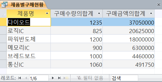 ▶ 쿼리 이름은 ‘제품별구매현황’으로 하시오.