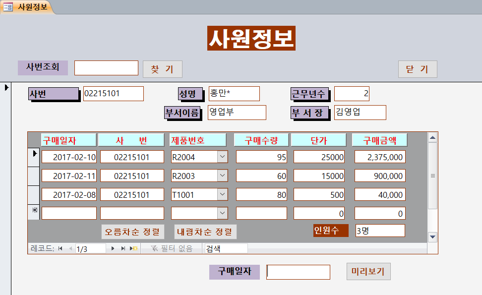 ▶ ‘구매일자별 구매금액 보고서’ 보고서를 ‘인쇄 미리 보기’ 형태로 연 후 ‘사원정보’ 폼을 닫을 것
