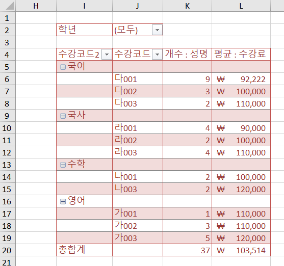 ▶ ‘수강코드’의 첫 번째 글자가 “가”면 “영어”, “나”면 “수학”, “다”면 “국어”, “라”면 “국사”로 그룹을 작성하시오.