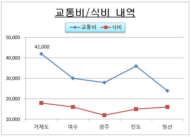 ① ‘여행지’별로 ‘교통비’와 ‘식비’ 계열만 표시되도록 데이터 범위를 지정하고, 차트 종류를 ‘표식이 있는 꺽은선형’으로 변경하시오.