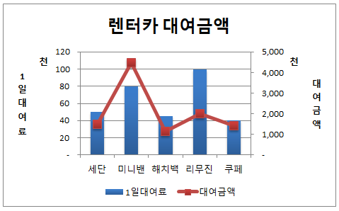 ① ‘차종’별 ‘대여금액’의 데이터가 차트에 표시되도록 데이터 범위를 추가하고, ‘보조 축’으로 지정한 후 차트 종류를 ‘표식이 있는 꺽은선형’으로 변경하시오.