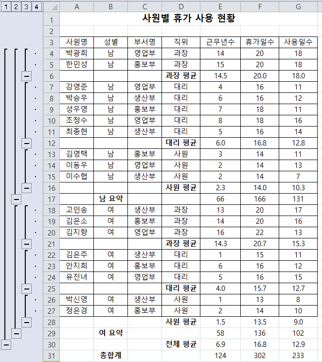 [부분합] 기능을 이용하여 ‘사원별 휴가 사용 현황’ 표에 <그림>과 같이 성별별 ‘근무년수’, ‘휴가일수’, ‘사용일수’의 합계를 계산한 후 직위별 ‘근무년수’, ‘휴가일수’, ‘사용일수’의 평균을 계산하시오.