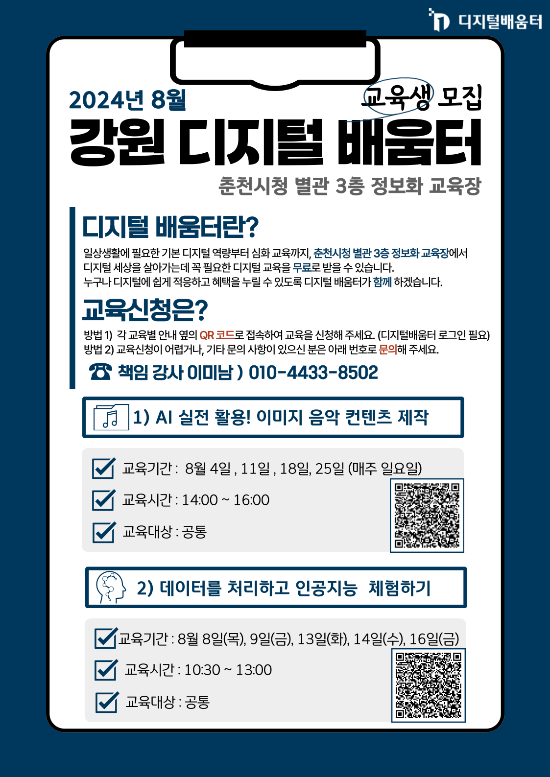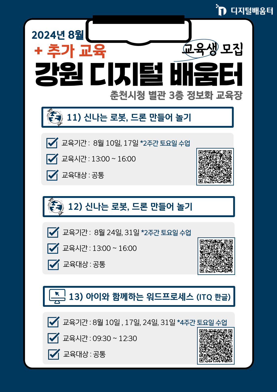 | 강원도 춘천 | 상설디지털배움터 7월 무료교육 안내~!! (1) | 2024.07.15 |