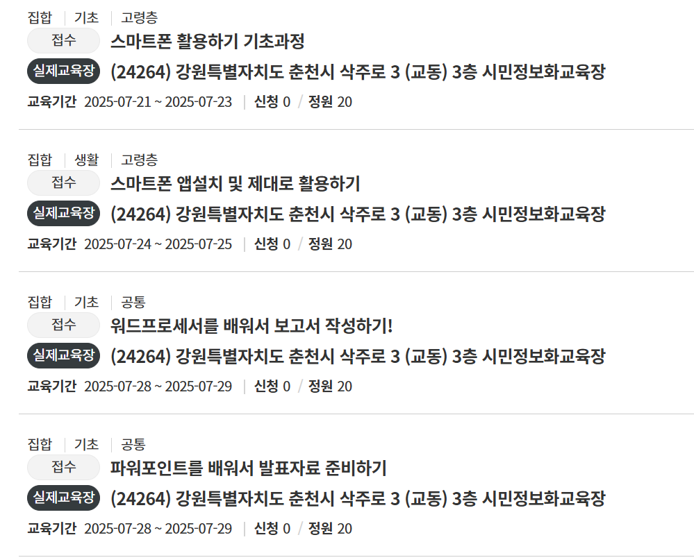 | 강원도 춘천 | 상설디지털배움터 7월 무료교육 안내~!! (1) | 2024.07.15 |