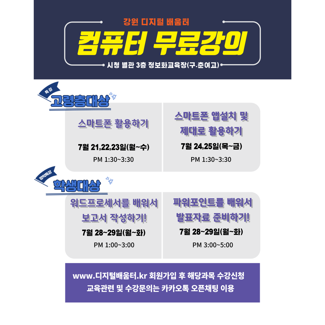 강원디지털배움터 거점센터 7월 추가 교육안내입니다.