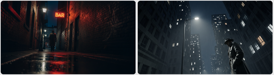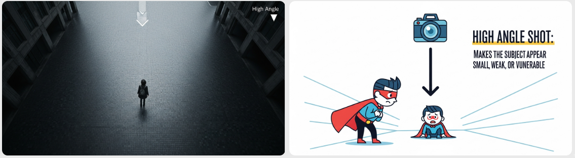 - 효과: 인물이 작고 위축되어 보입니다. 외로움, 패배감, 무력함, 혹은 처절한 상황을 표현할 때 효과적입니다. 전체적인 상황을 조망할 때도 사용됩니다. (예: 빌딩 꼭대기에서 아래를 내려다보는 샷)