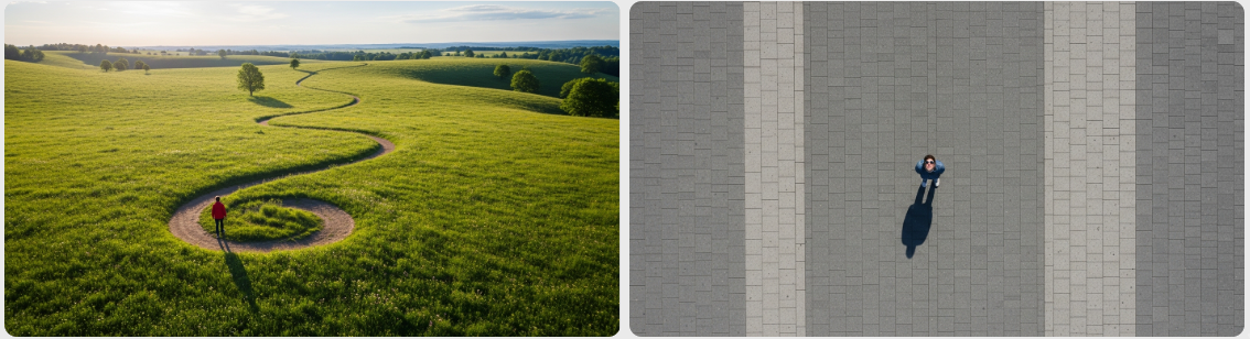 카메라 높낮이의 변화만으로도 인물의 심리 상태나 힘의 관계를 극적으로 표현할 수 있습니다. 이 두 가지 스토리보드 앵글은 대조적인 효과를 냅니다.