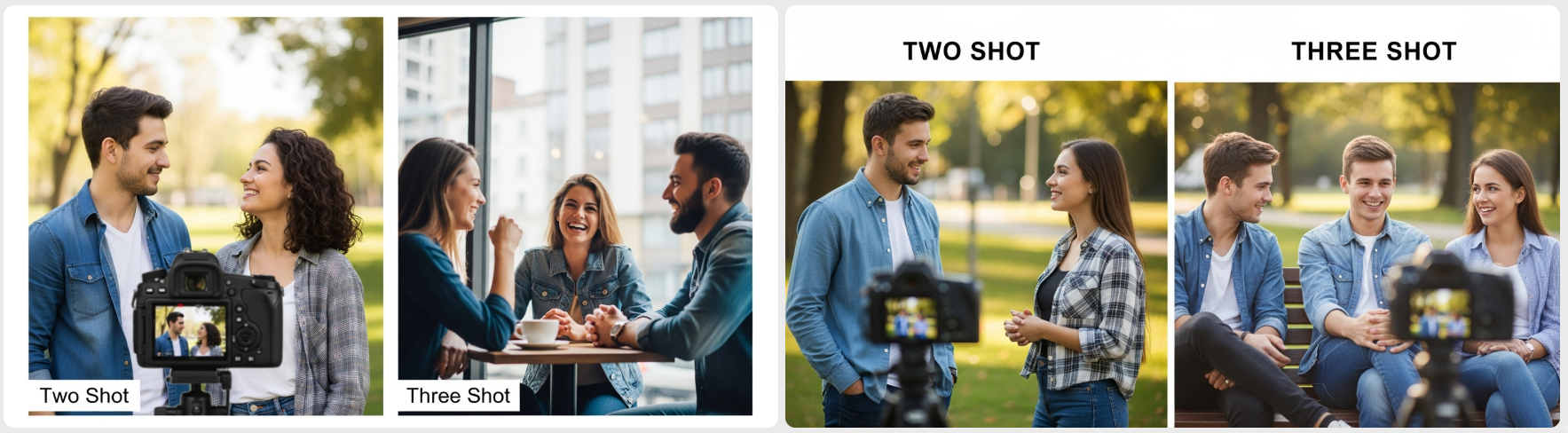 ② 투 샷 (Two Shot) / 쓰리 샷 (Three Shot) 화면에 두 명, 혹은 세 명의 인물을 함께 담는 샷입니다. 인물들 사이의 관계, 대화의 주도권, 미묘한 긴장감 등을 한 프레임 안에서 보여줄 때 효과적입니다. 스토리보드를 그릴 때 인물 간의 거리를 어떻게 배치하느냐에 따라 관계를 암시할 수 있습니다.